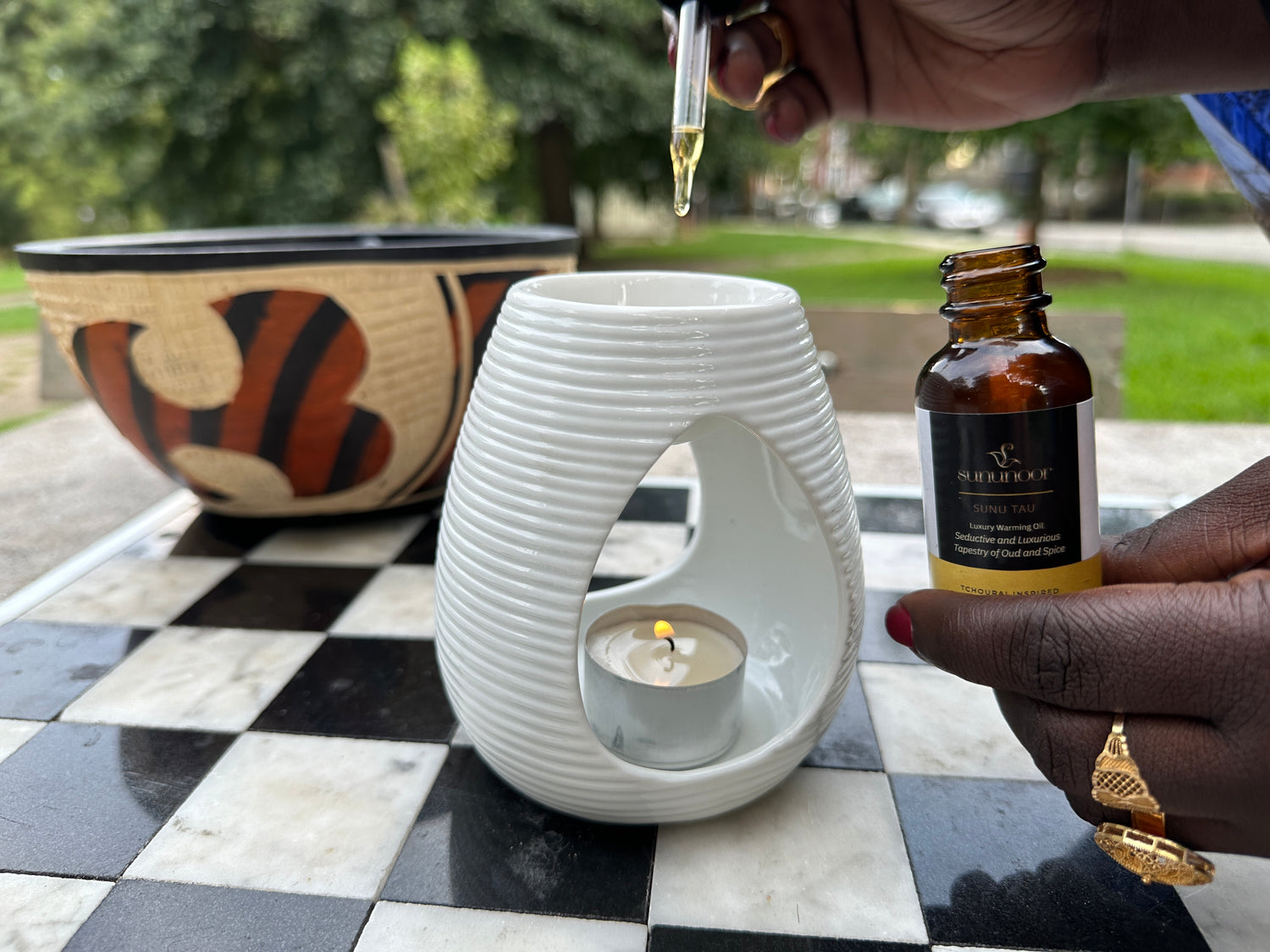 - Add a few drops of your chosen fragrance oil to the water in the recessed area. Start with a small amount and adjust based on your preference for scent strength.