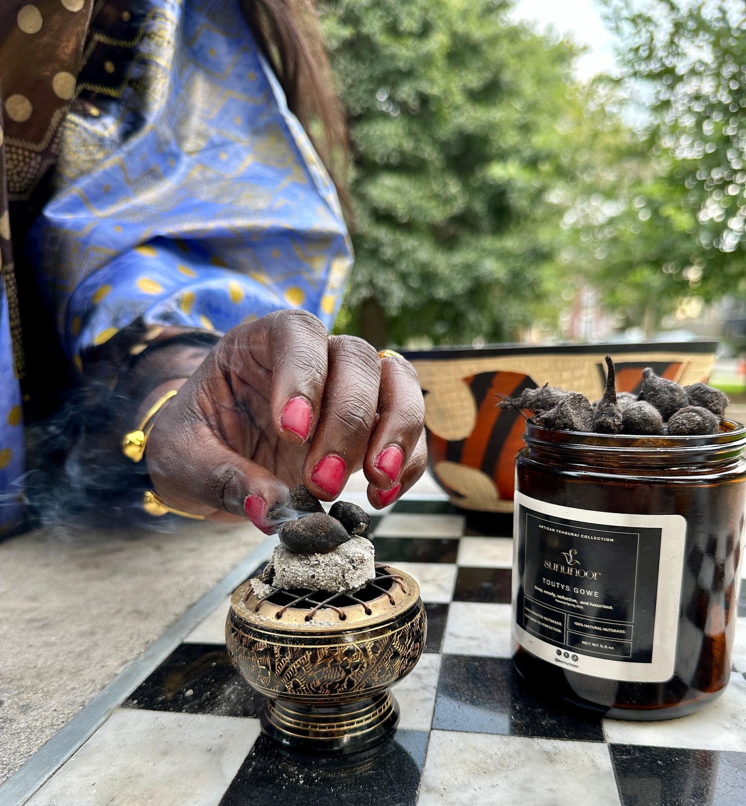 This small yet mighty roasted nutgrass is perfumed to perfection, offering you a tantalizing blend of spice and luxury. Immerse yourself in the Senegalese teranga spirit with Touty's Digi. Perfumed by Bajjin (Aunty) Touty herself, this incense is certain to captivate. Simply heat up the charcoal and allow Touty's Digi to infuse your space with a warm and inviting Senegalese ambiance.